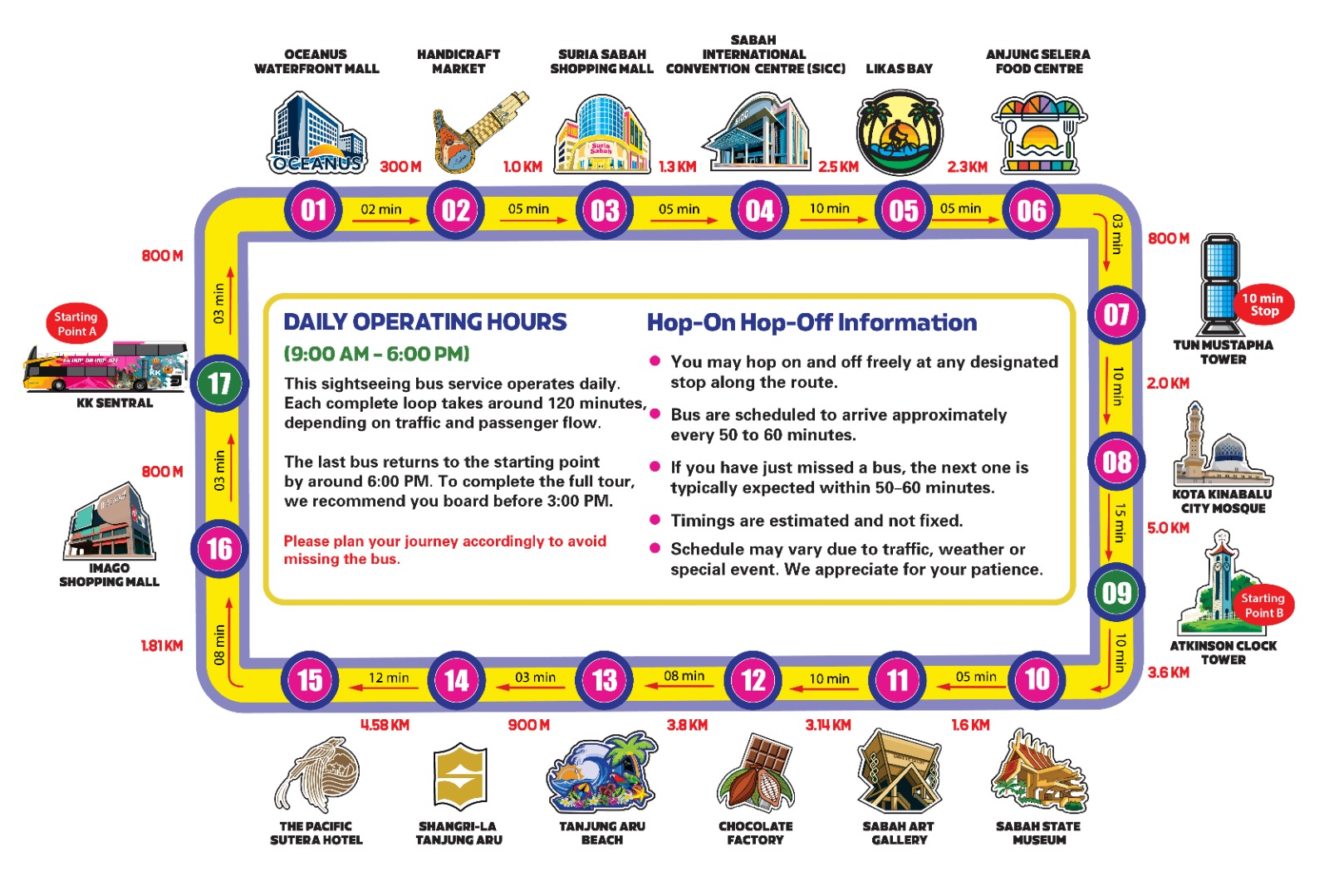 본 투어버스는 코타키나발루 중앙역(KK Sentral)과 앳킨슨 시계탑(Atkinson Clock Tower)을 기점으로 도심과 해안 주요 관광지를 연결하는 단일 순환 루트로 운영되며, 총 17개 공식 정류장에서 자유롭게 승하차가 가능하다.
