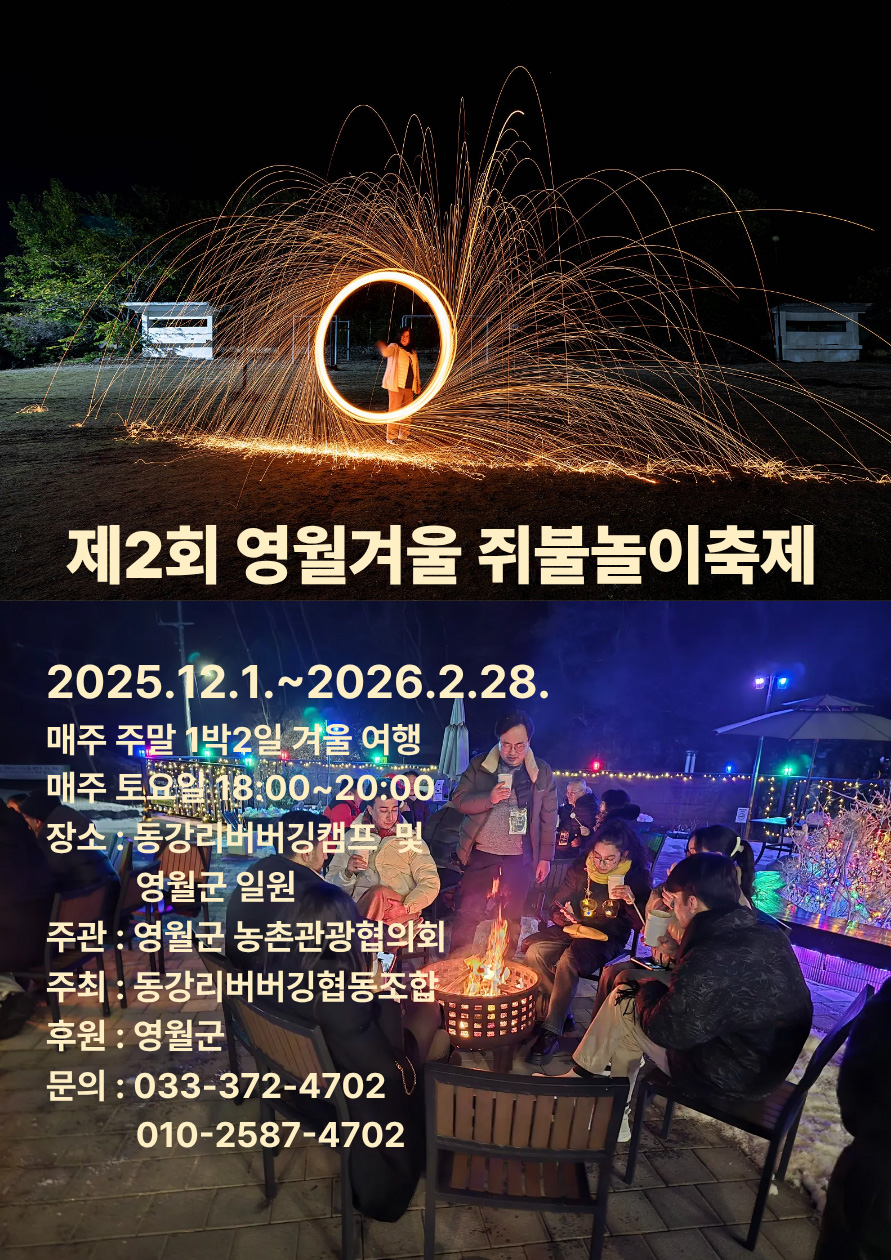 강원도 영월군은 사계절 내내 지속 가능한 관광 기반을 구축하고 지역경제를 활성화하기 위해 ‘제2회 2026 영월 겨울 쥐불놀이 축제’를 개최한다. 이번 축제는 영월군농촌관광협의회가 주관하고 영월군이 후원한다.