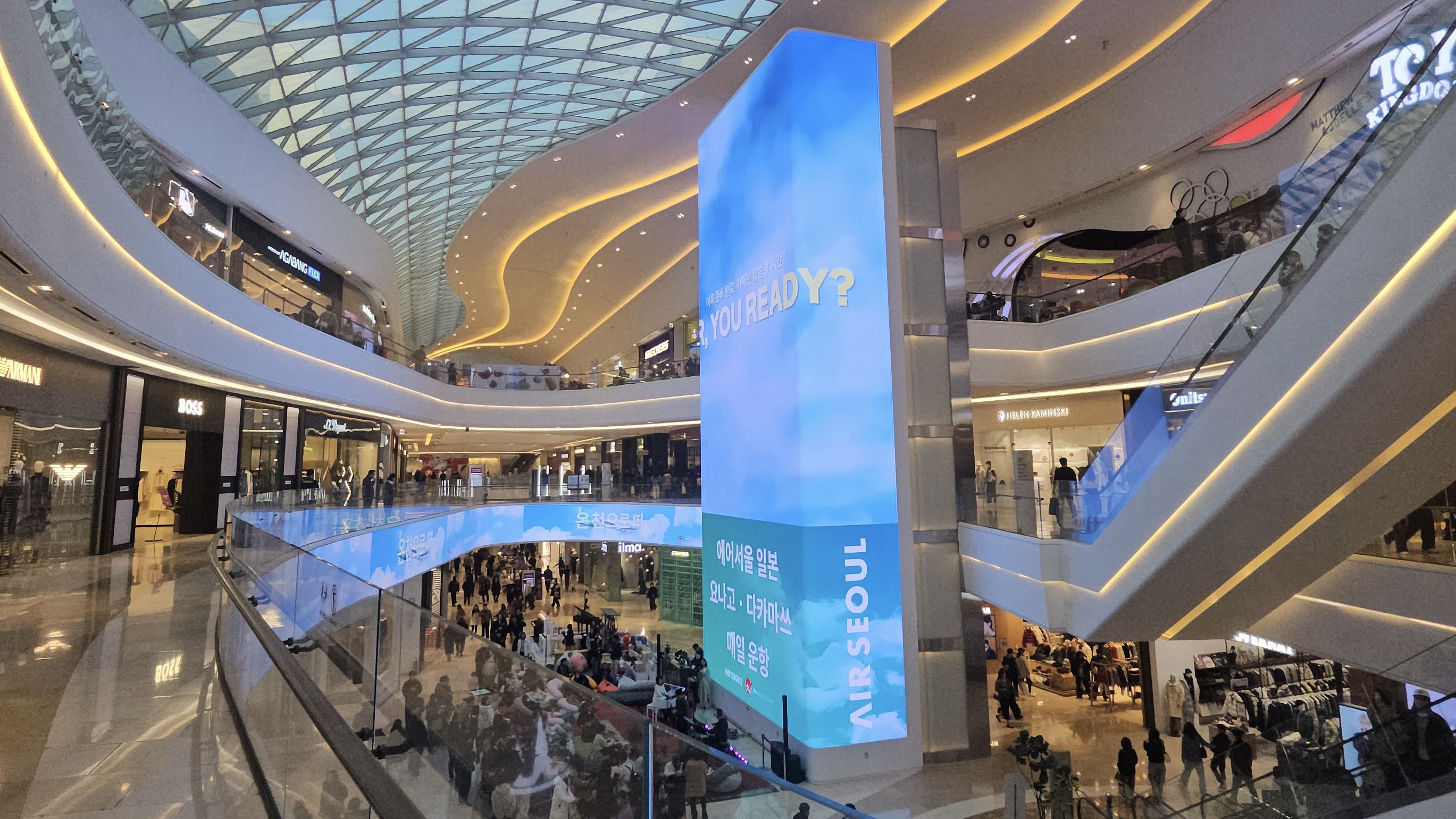 높이 22m의 초대형 미디어타워와 총 길이 78m에 달하는 파노라마스크린에는 에어서울 항공기와 함께 요나고·다카마쓰의 감각적인 풍경이 펼쳐지며, 마치 현지에 와 있는 듯한 몰입감을 전한다.