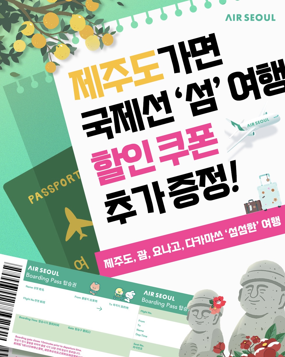 에어서울은 프로모션 기간 김포~제주 노선 탑승객에게 괌·요나고·다카마쓰 노선에서 사용할 수 있는 항공 운임 할인 쿠폰을 제공한다.