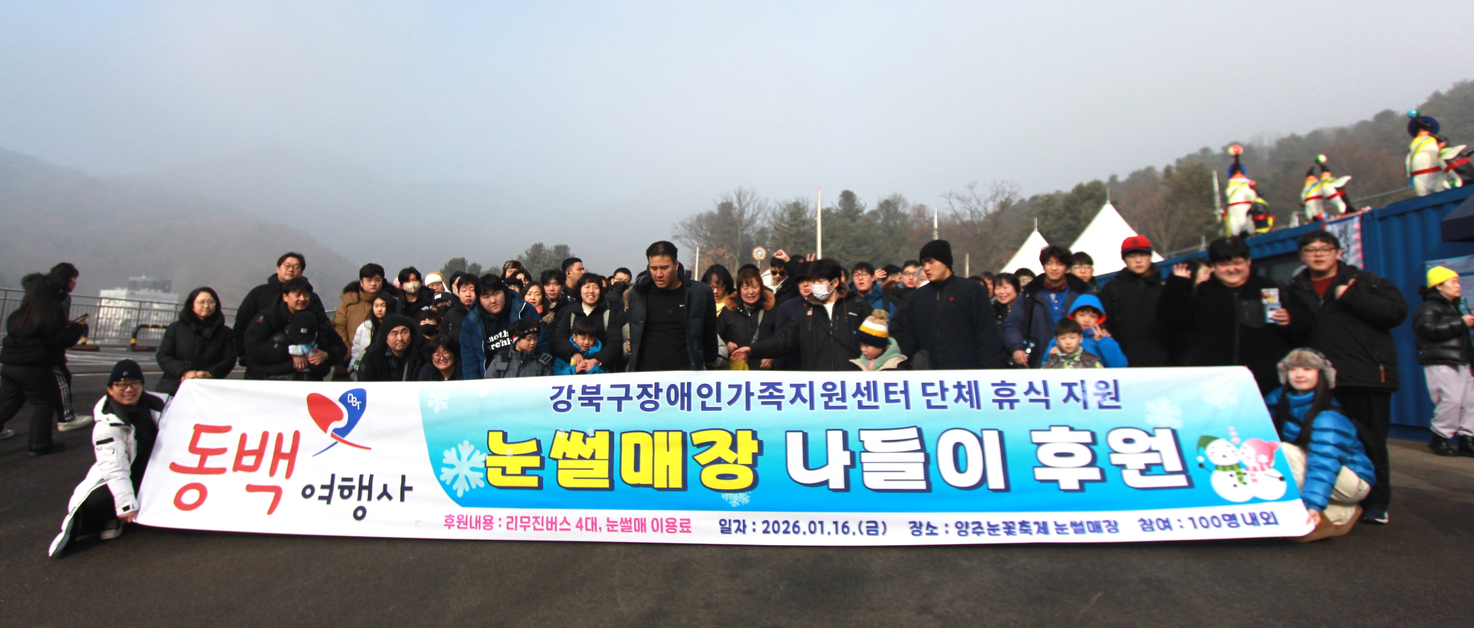 강북구장애인과 가족 100명은 이날 동백여행사의 따뜻한 후원으로 양주에 위치한 눈꽃축제썰매장에서 가족들과 함께 신나는 겨울 나들이를 즐겼다.