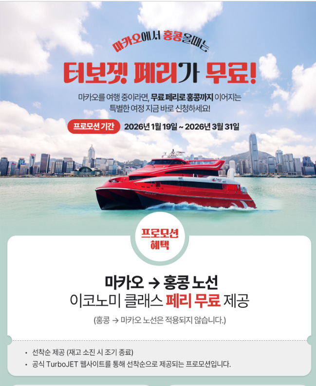 이번 프로모션은 마카오와 홍콩 간 이동을 하나의 여행으로 자연스럽게 이어갈 수 있도록 기획됐다. 오는 3월 31일까지 유효한 한국 여권과 홍콩 방문 전 7일 이내 마카오 입국 탑승권(비행기)을 소지한 한국 국적 여행객을 대상으로, 마카오에서 홍콩으로 이동하는 이코노미 클래스 페리 티켓 1매를 선착순으로 무료 제공한다. 무료 페리 티켓은 홍콩–마카오 노선을 운항하는 TurboJET을 통해 신청 가능하며, 재고 소진 시 조기 종료된다.
