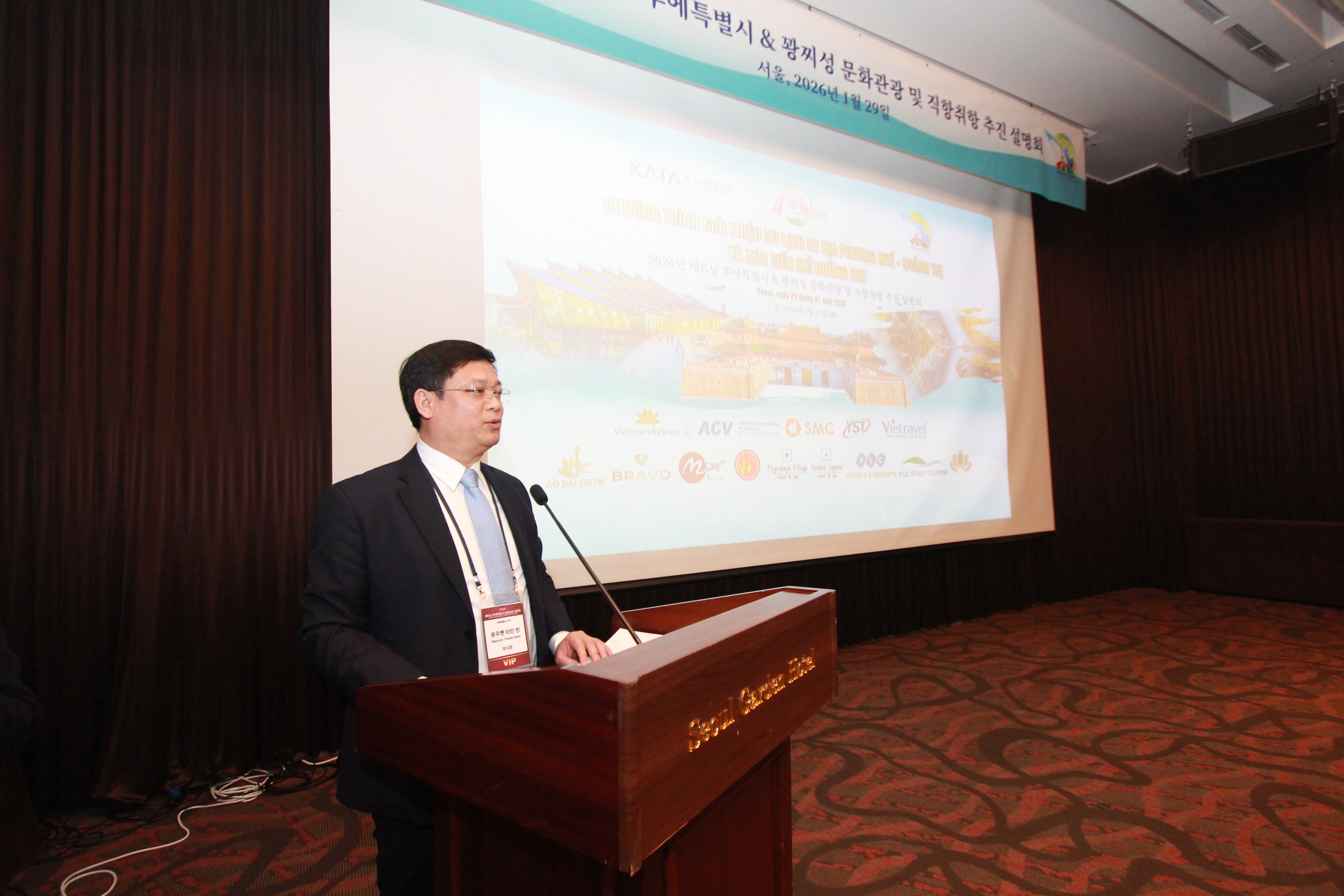 행사에 앞서 응우옌 타인 빈 후에시 부위원장은 인사말을 통해 “한국은 베트남의 가장 중요한 관광시장으로 2026년도는 500만 명 이상 방문이 기대되고 있으며, 1인당 소비 수준 가장 높은 시장이다. 작년 후에시에는 190만 명의 외국관광객들이 방문했지만, 이중 한국관광객은 2만명 수준으로 13위에 그치고 있다.”며,“더 많은 한국관광객을 유치하기 위해서는 인천~후에시 직항노선 개설이 절실해 이번 설명회를 통해 후에시와 꽝찌성의 관광매력을 홍보하고, 한국여행업협회와의 협력관계를 통해 인천과 부산에서 직항노선 개설을 추진하겠다”고 밝혔다.