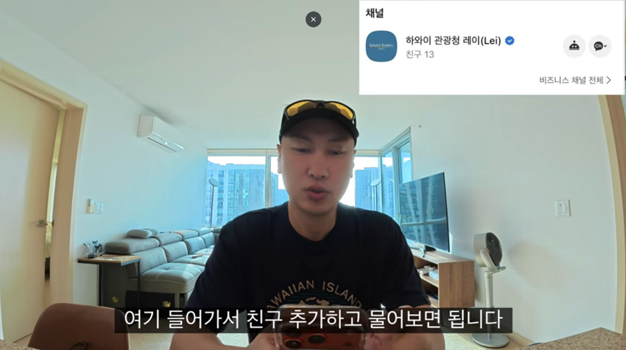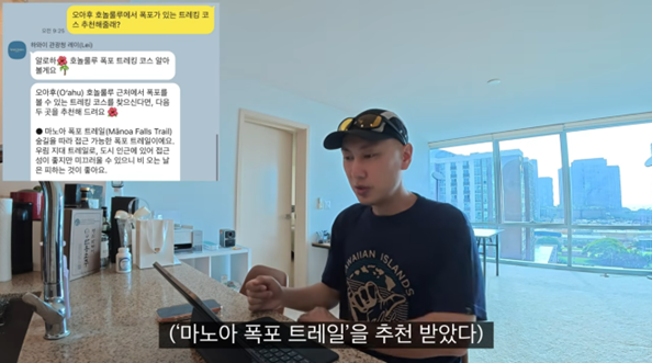 유튜버 ‘방랑자 차박차박’이 하와이에서 카카오톡 AI 가이드 ‘레이(Lei)’를 활용해 여행 정보를 확인하는 모습.