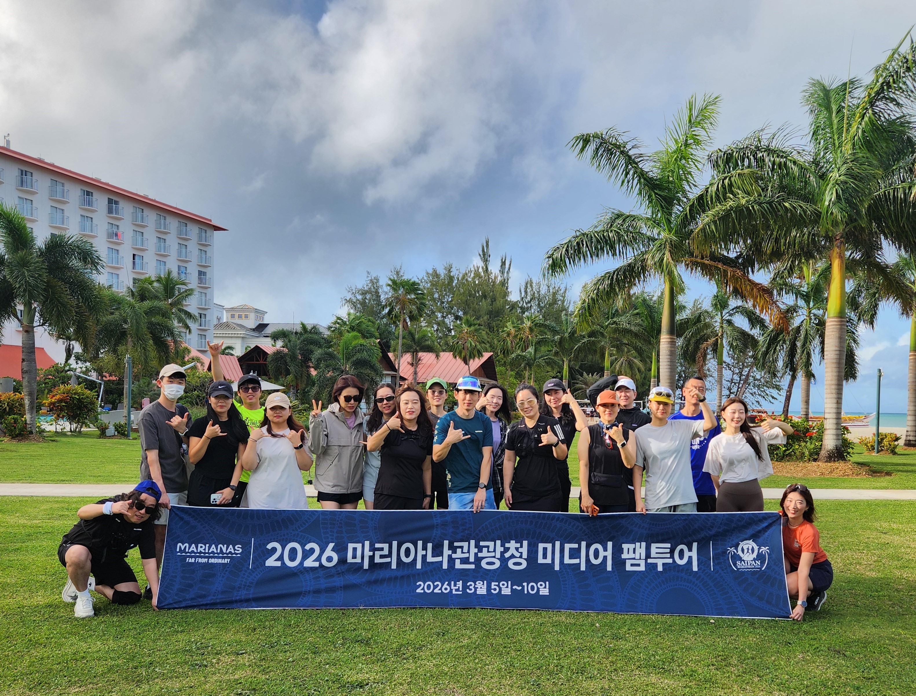 출발 전 마리아나관광청 직원들과 마라톤에 참석한 인플런서들과 기념촬영하는
