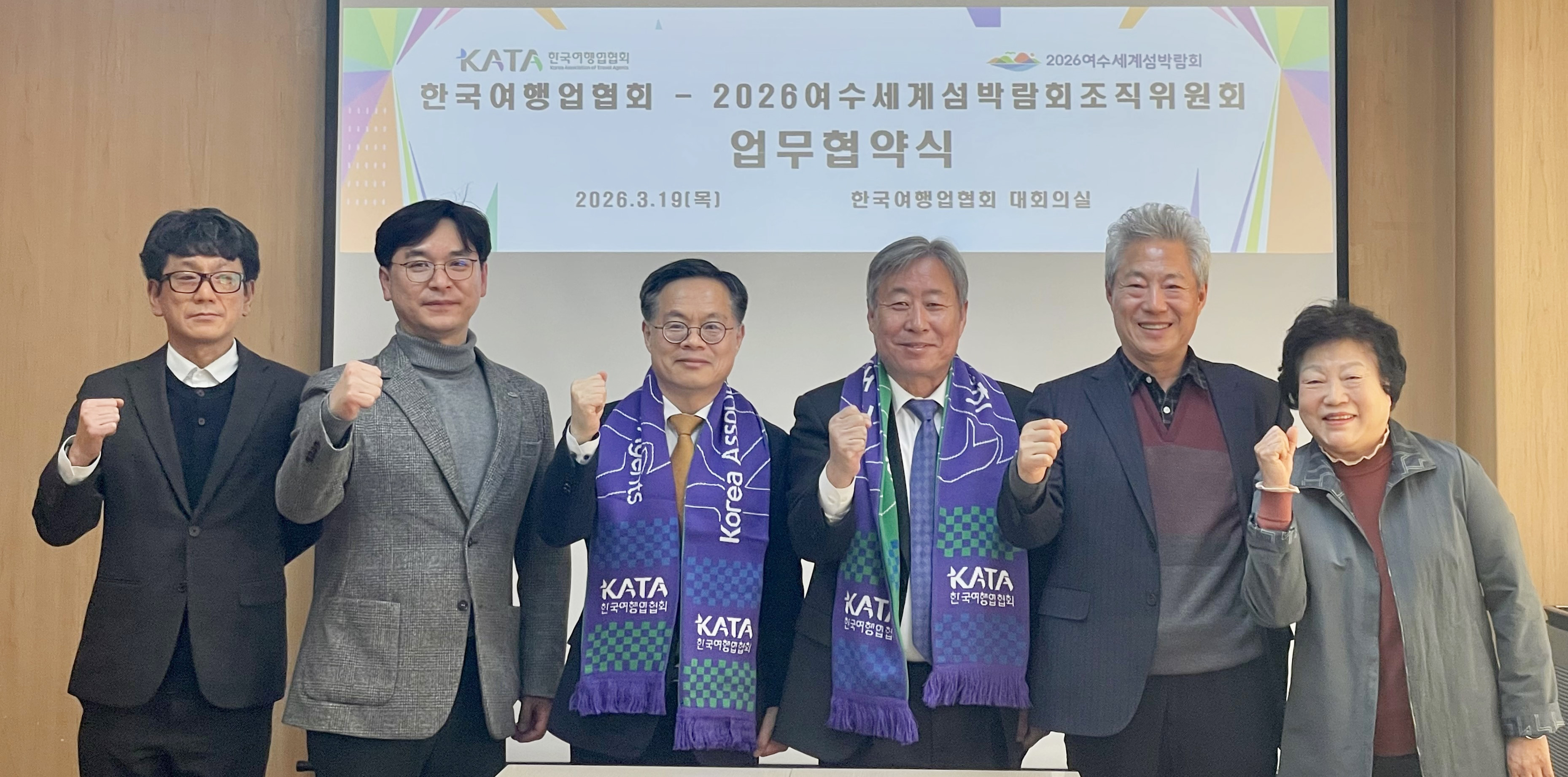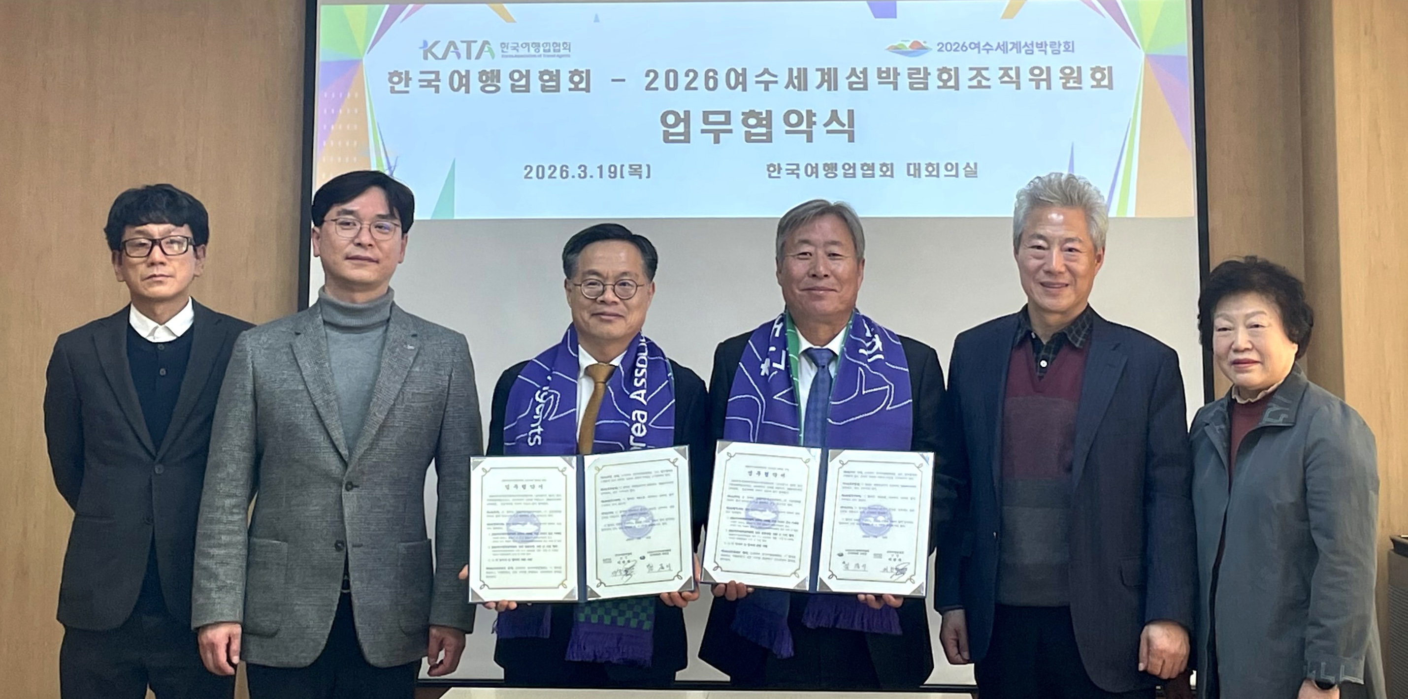 한국여행업협회(회장 이진석, 이하 KATA)와 2026여수세계섬박람회조직위원회(위원장 정기명, 이하 조직위)는 3월 19일 한국여행업협회 대회의실에서 업무 협약을 맺고, 2026여수세계섬박람회 성공개최 및 국내·외 관광객 유치를 위한 마케팅, 관광상품 개발과 홍보 등에 협력하기로 했다.