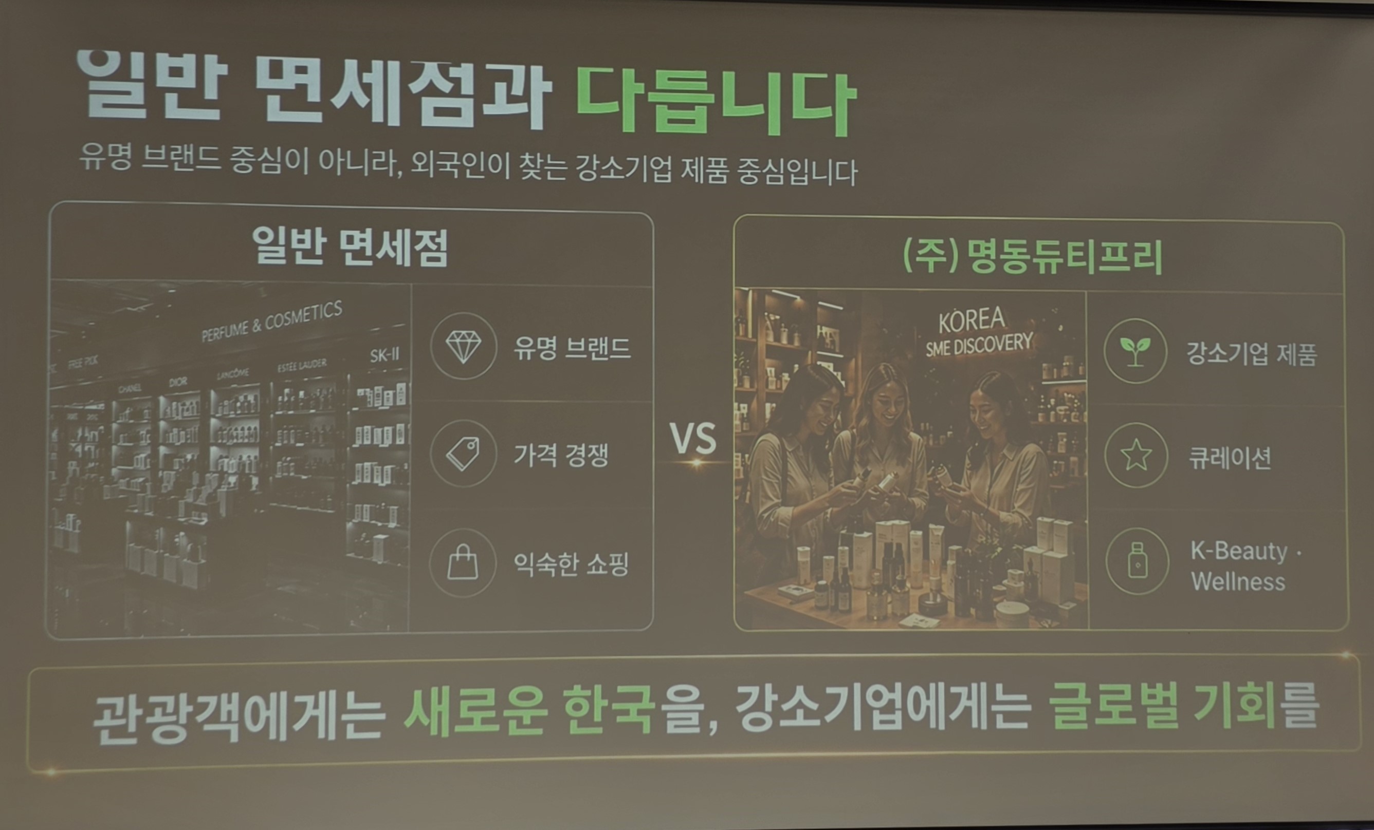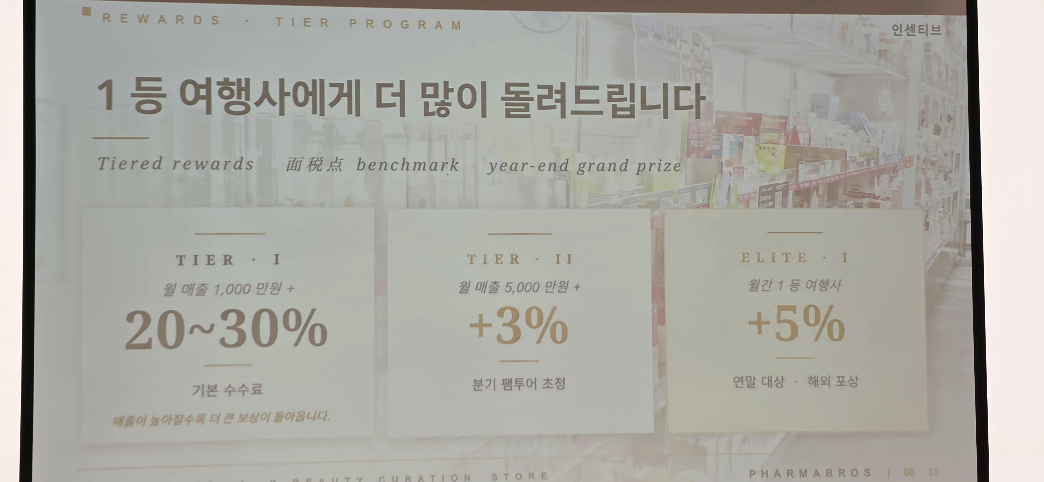 명동역 인근 '시오레 플래그십 스토어(SIORE Flagship Store)'을 활용해 K뷰티와 건강기능식품을 전문적으로 판매하는 매장으로 유명한 인플루언서약사들을 활용한 콘텐츠로 외국인관광객 유입을 확대하고, 고객을 보내주시는 인바운드여행사에는 구매금액 당 지급하는 수수료 안내와 여행사에 대한 추가 인센티브를 제공을 설명했다.