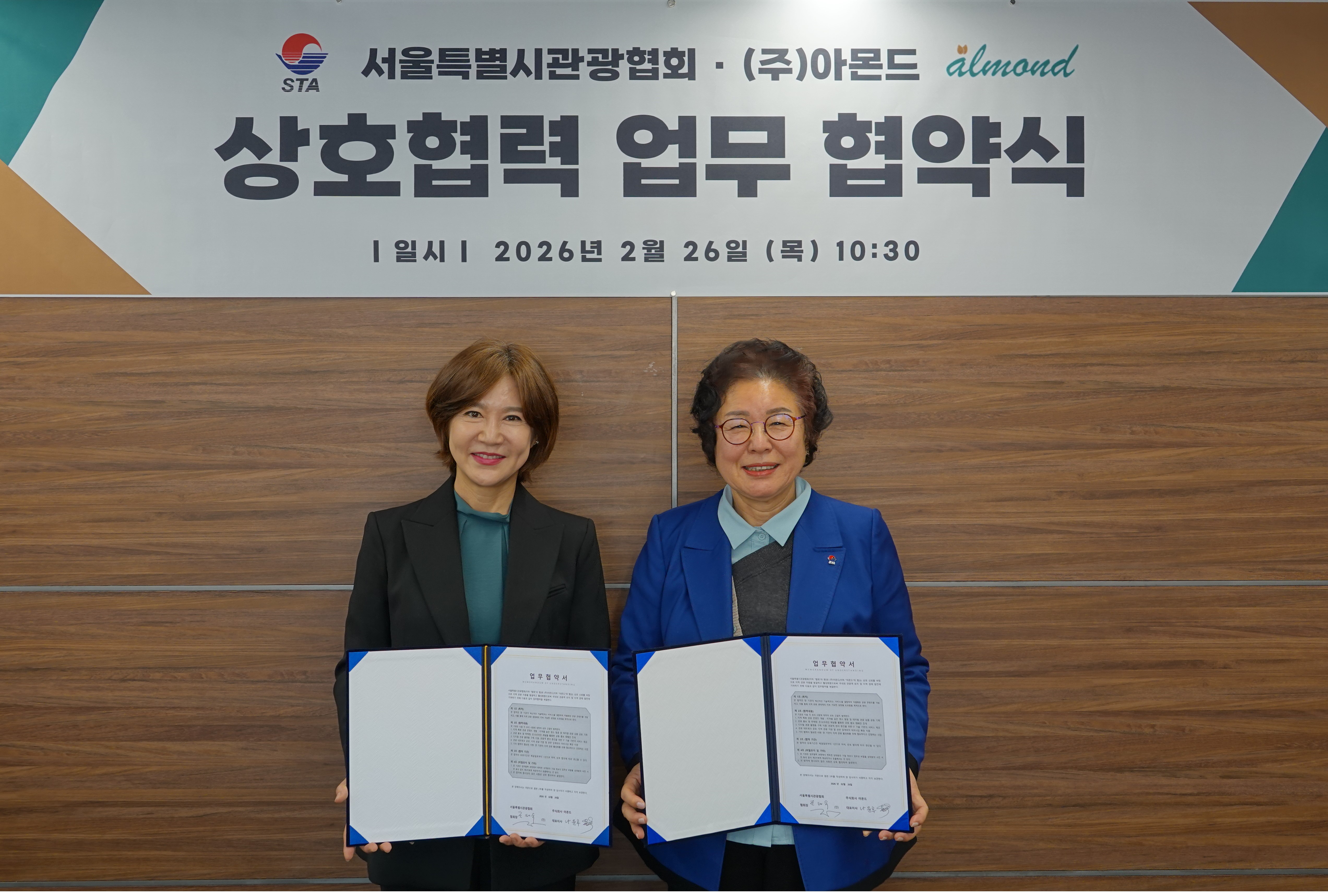 서울특별시관광협회(회장 조태숙)와 (주)아몬드(대표이사 나윤후)가 26일 서울특별시 관광협회 대회의실에서 업무협약(MOU)을 체결하고, AI 기술과 방송·영상 콘텐츠를 결합한 혁신적인 지역 관광 활성화 모델 구축에 나섰다.
