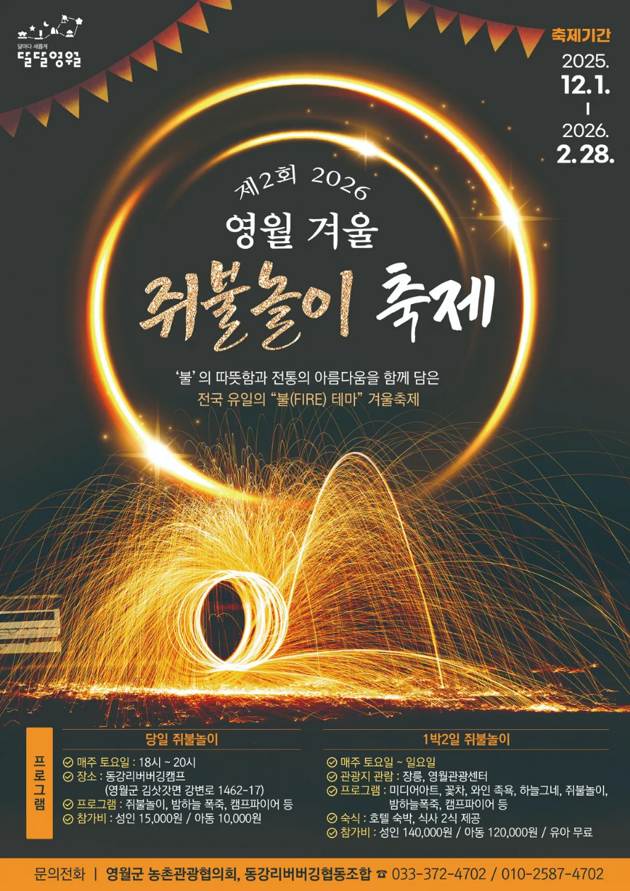 강원도 영월군은 사계절 내내 지속 가능한 관광 기반을 구축하고 지역경제를 활성화하기 위해 ‘제2회 2026 영월 겨울 쥐불놀이 축제’를 개최한다. 이번 축제는 영월군농촌관광협의회가 주관하고 영월군이 후원한다.