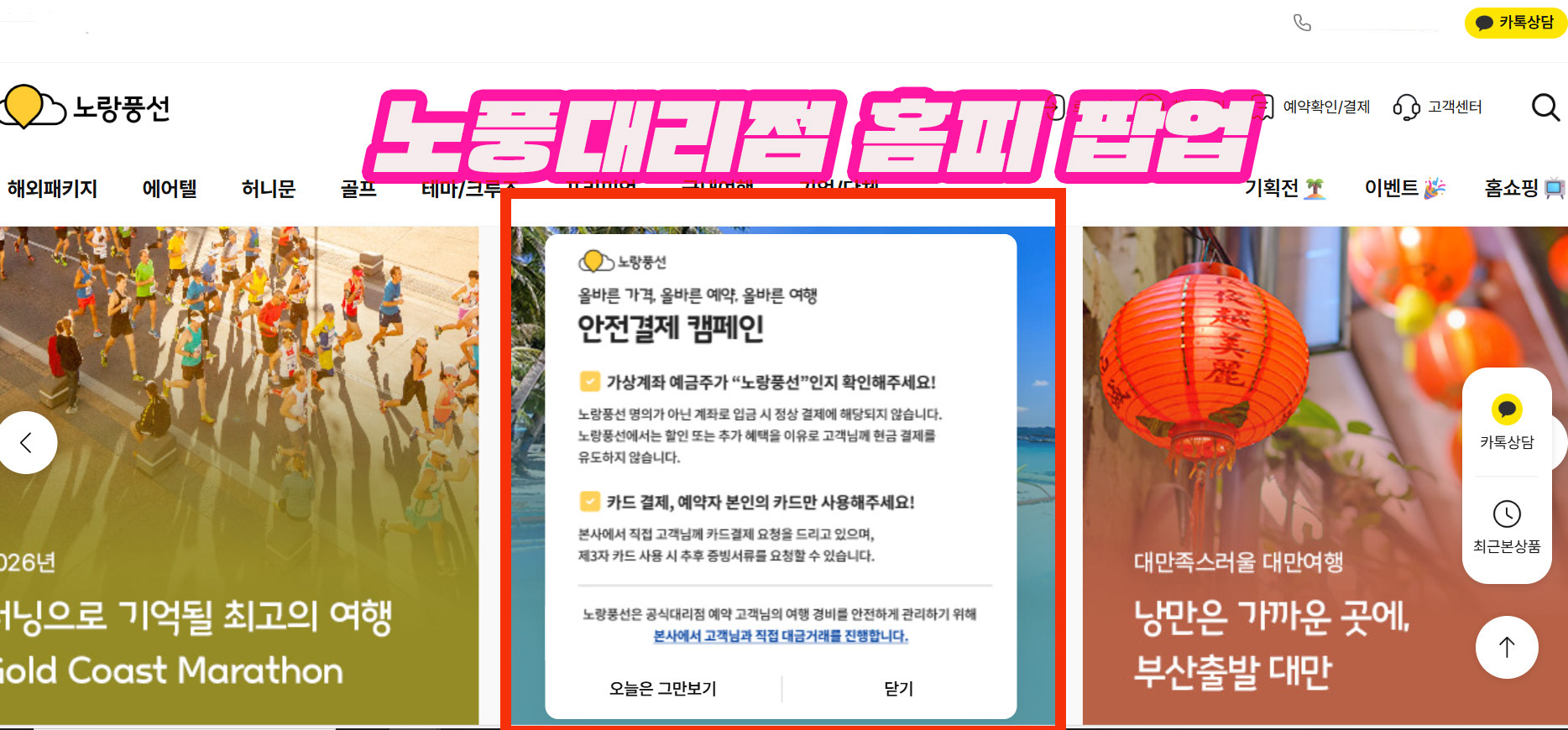 대리점 횡령사건 이후 노랑풍선 대리점 홈피에 뜬 팝업광고....
