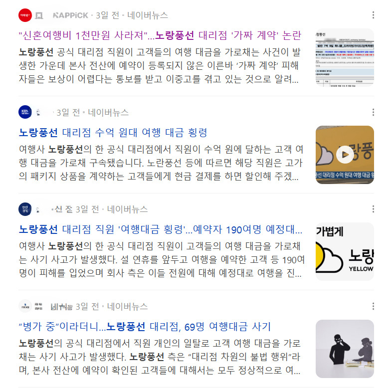 노랑풍선 강동구 대리점 직원의 횡령사건이 보도된 내용들