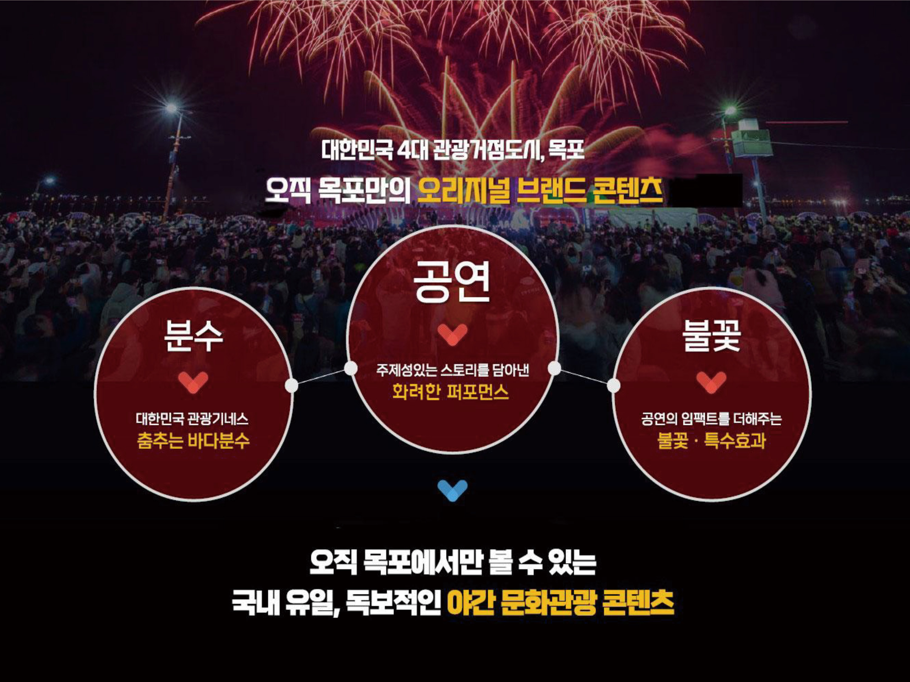 체류형 야간관광 육성을 위해 기획된 '목포 해상 W쇼'는 최대 75m 수직 분수와 해상무대 공연이 결합된 행사로 2021년부터 5년간 551회 공연을 진행해 105만 명을 동원했다.
