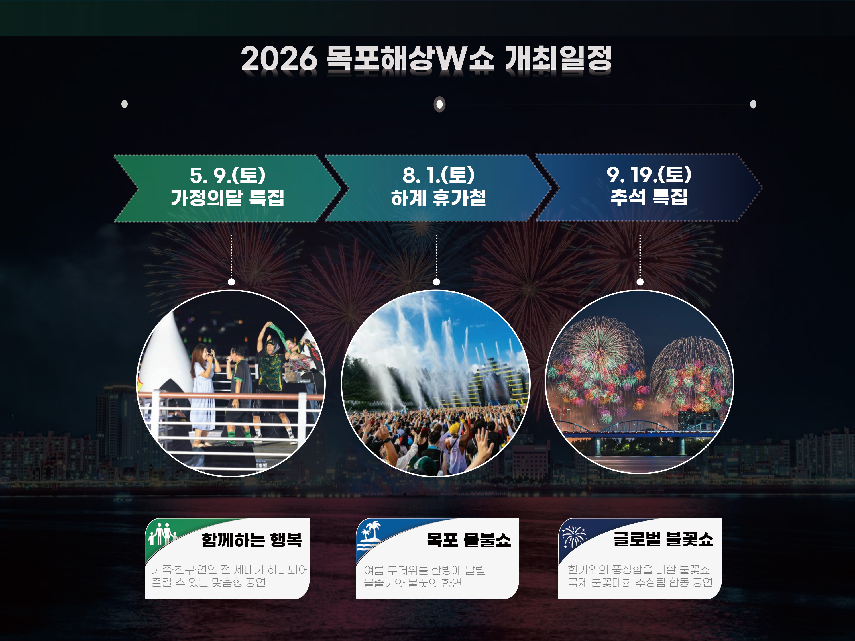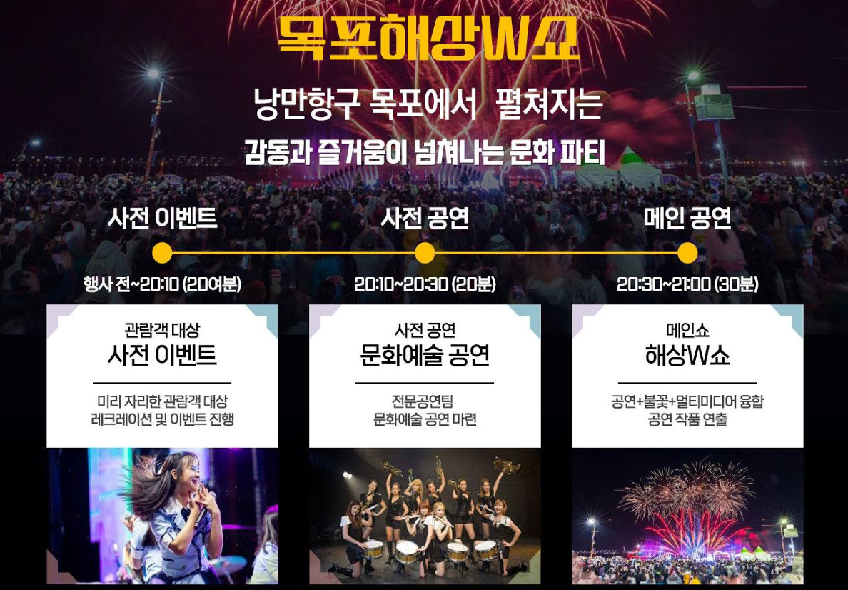 ‘목포 해상 W쇼’는 해상무대를 중심으로 ▲K-POP 공연 ▲춤추는 바다분수 ▲대형 불꽃쇼 ▲미디어아트가 결합된 복합 콘텐츠다.