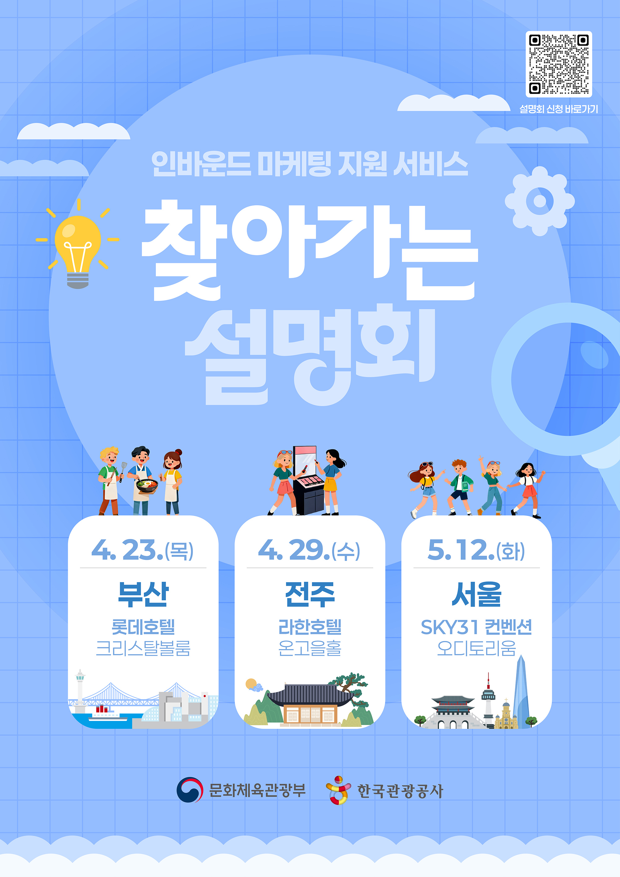 문화체육관광부와 한국관광공사(이하 ‘공사’)는 외래관광객 유치를 희망하는 업계를 대상으로 ‘인바운드 마케팅 지원 서비스’ 3대 권역별 찾아가는 설명회를 개최한다.